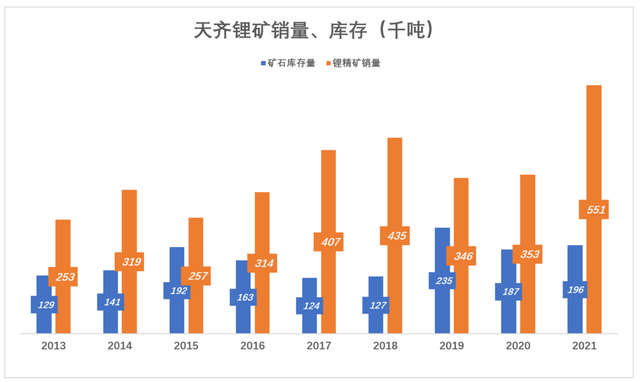 由于附加值遠(yuǎn)低于鋰化合物,鋰精礦銷售收入占比雖不足四成,卻消耗了大部分的鋰礦石。2021年鋰精礦銷量達(dá)55萬(wàn)噸,而天齊在泰利森的份額不過(guò)60多萬(wàn)噸。