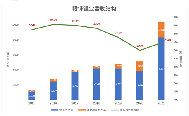2021年,鋰系列產(chǎn)品收入達(dá)83.2億、占營(yíng)收的74.6%;鋰電池及產(chǎn)品收入也首次突破20億。