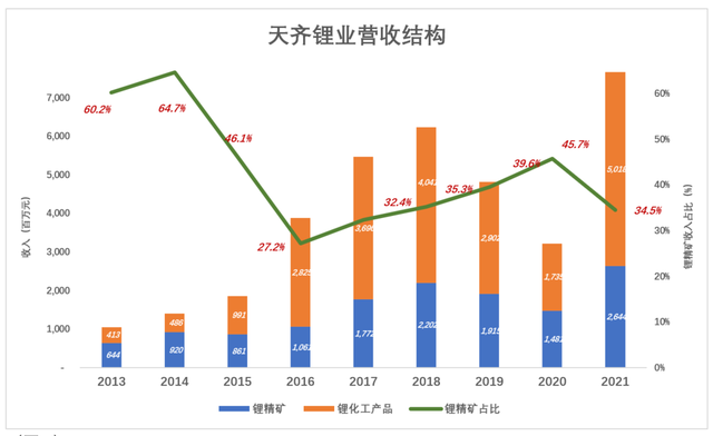 收購(gòu)泰利森51%權(quán)益前,天齊六成以上收入來(lái)自鋰精礦銷售,鋰化合物業(yè)務(wù)相對(duì)弱小。鎖定鋰礦石供給后,天齊鋰化合業(yè)務(wù)發(fā)展迅速,2021年?duì)I收突破50億,較2014年增長(zhǎng)931%。