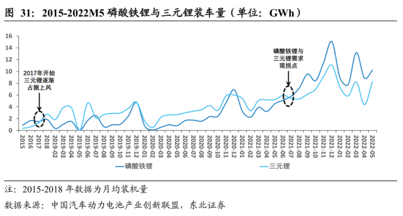 2015-2022M5 磷酸鐵鋰與三元鋰裝車(chē)量