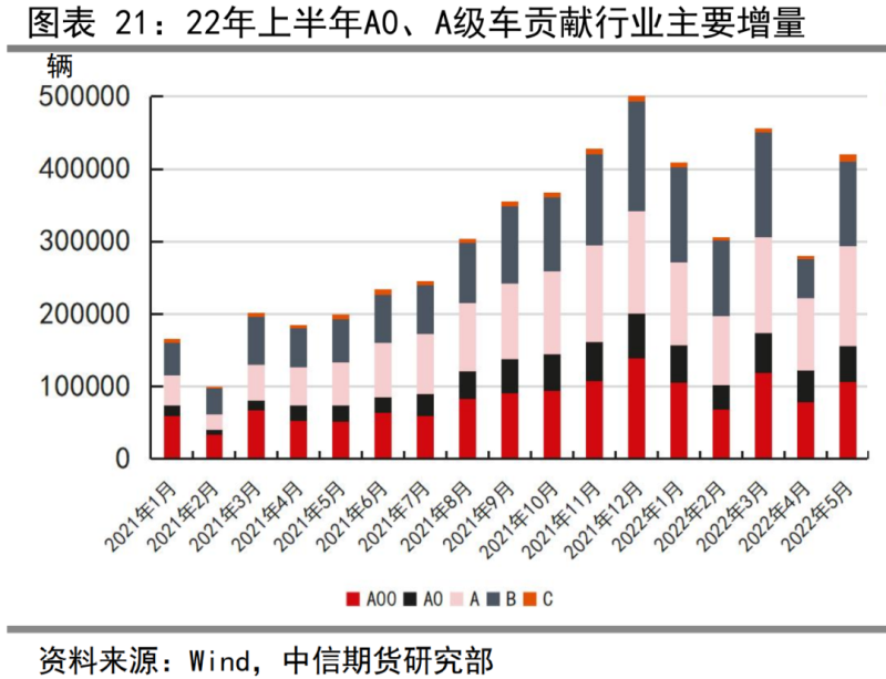 如上圖所示,2022年1-5月,A級(jí)車(chē)銷(xiāo)58.0萬(wàn)輛,同比增長(zhǎng)157%;B級(jí)車(chē)銷(xiāo)55.0萬(wàn)輛,同比增長(zhǎng)112%,增速均超過(guò)了A00級(jí)車(chē)。所以,磷酸錳鐵鋰的裝機(jī)量或?qū)O大受益于這一趨勢(shì)變化。