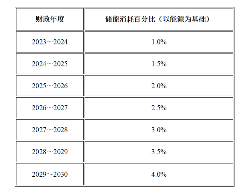而儲能義務(wù)(ESO)規(guī)定,在2023年~2024年期間,太陽能發(fā)電設(shè)施或風(fēng)力發(fā)電設(shè)施或通過儲能系統(tǒng)消耗的總能源比例應(yīng)設(shè)定為1%。并在2030年逐步上升至4%,如下表所示。