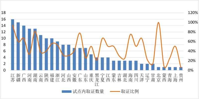 圖2 各省(區(qū)、市)增量配電業(yè)務(wù)試點取證數(shù)量及取證比例