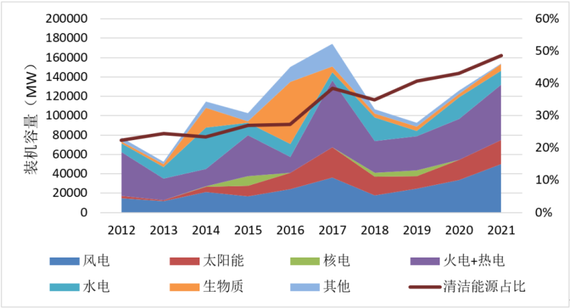 圖1 十年來各類型機組裝機容量變化及清潔能源占比趨勢