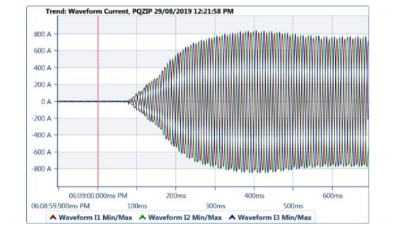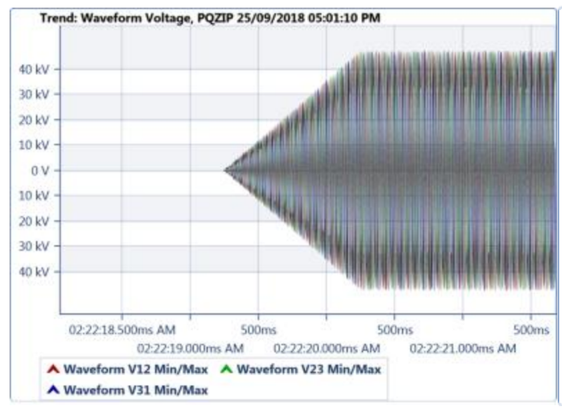 在 Dalrymple,GF-BESS黑啟動(dòng)了當(dāng)?shù)氐?33 kV 配電網(wǎng)絡(luò)。這是通過對(duì) GF-BESS連接的變壓器 (6 x 6 MVA) 和其中一個(gè)變電站變壓器 (25 MVA) 進(jìn)行軟充電以及隨后對(duì)兩個(gè) 33 kV 配電饋線充電來實(shí)現(xiàn)的。變壓器充電瞬間電壓和電流波形在圖 10 中顯示。當(dāng)電壓在一秒鐘內(nèi)上升時(shí),電流是如此微不足道,以至于它們?nèi)匀坏陀诟咚儆涗浧鞯氖叭¢撝?。這種方法完全消除了變壓器和電纜涌流。