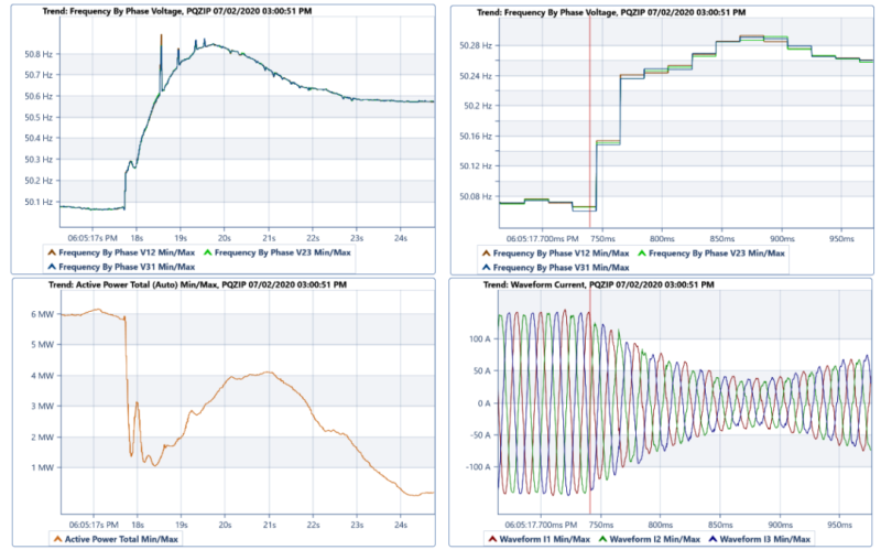 圖 5:正向RoCoF 事件顯示來自 Dalrymple BESS 的慣量響應(yīng)發(fā)生在高速數(shù)據(jù)記錄器檢測(cè)到頻率增加之前。左上 – 8 秒頻率視圖;左下 – 8 秒有功功率視圖;右上角 – 300 毫秒頻率視圖;右下角 – 300 ms 電流波形。