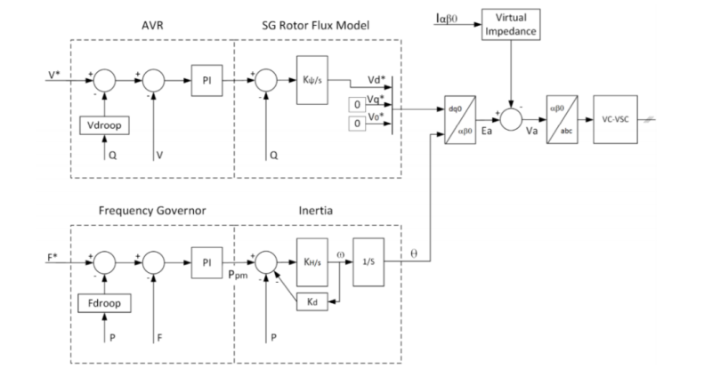 初級(jí)控制的核心是虛擬同步發(fā)電機(jī) (VSG) - 一種結(jié)合了合成慣量、合成阻抗、頻率調(diào)節(jié)器、同步發(fā)電機(jī)轉(zhuǎn)子磁通模型和自動(dòng)電壓調(diào)節(jié)器 (AVR) 的大功率變流器。其控制圖如圖3所示。