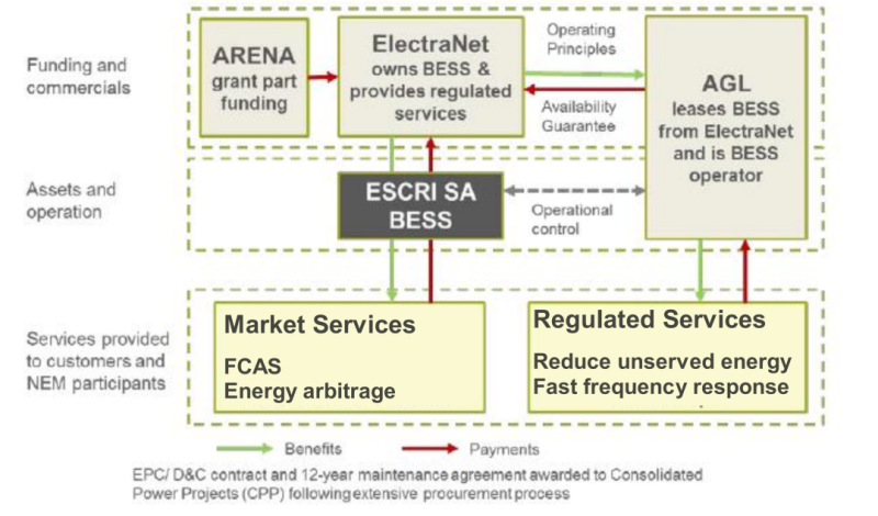 如圖所示,來自 ARENA 的基金為該項(xiàng)目提供了部分資金。ElectraNet 通過Dalrymple BESS的所有權(quán)向市場提供受監(jiān)管的服務(wù),而AGL通過租賃合約在在競爭市場中運(yùn)營BESS。 圖中的付款用紅色箭頭表示,獲益用綠色箭頭表示。