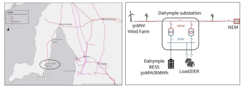 圖 1:左 - Dalrymple BESS、現(xiàn)有輸電資產(chǎn)和半島頂端的 Wattle Point 風(fēng)電場 [5];右 – 簡化的Dalrymple BESS 和微電網(wǎng)單線圖