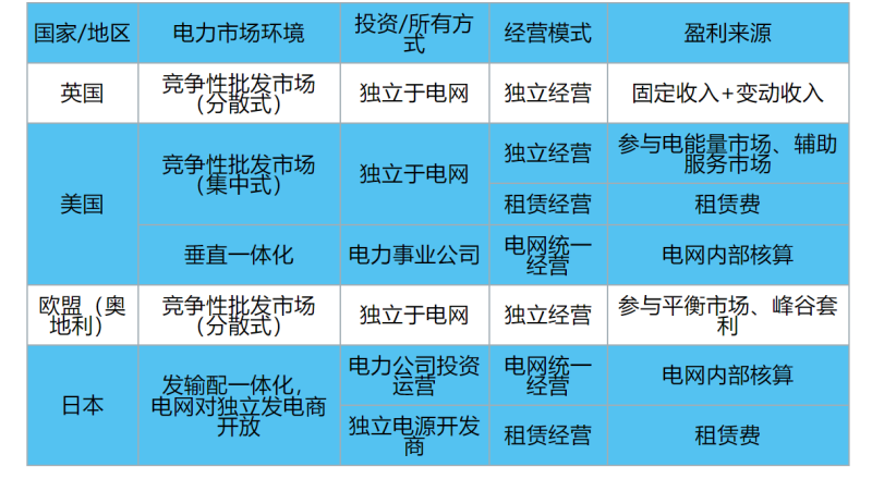 表1對(duì)英國(guó)、美國(guó)、歐盟和日本電力市場(chǎng)環(huán)境、抽水蓄能電站的投資(所有)方式、經(jīng)營(yíng)方式和盈利來(lái)源進(jìn)行了總結(jié)。