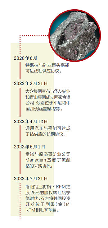 今年4月,通用汽車表示,已與總部位于瑞士的礦業(yè)巨頭嘉能可達(dá)成了鈷供應(yīng)協(xié)議,用于其奧特能電池;此前嘉能可已與特斯拉和寶馬簽署了鈷供應(yīng)協(xié)議。特斯拉不久前首次對外發(fā)布了電池供應(yīng)鏈中所有直接供應(yīng)商名單,為其提供鈷的還有華友鈷業(yè)、中偉新材料等;另外,今年3月,大眾集團(tuán)宣布與華友鈷業(yè)和青山集團(tuán)達(dá)成合作,將在印尼和中國組建合資企業(yè),以確保鎳和鈷的供應(yīng);而法國雷諾集團(tuán)于今年6月與摩洛哥礦業(yè)公司Managem達(dá)成了硫酸鈷的采購協(xié)議。