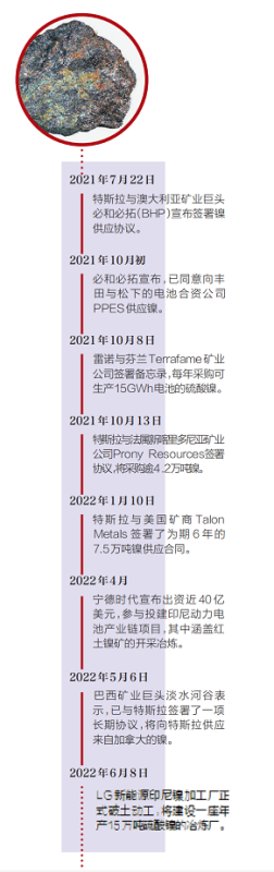 為此,特斯拉、寧德時(shí)代、LG新能源等車企和電池廠商都在極力搶奪鎳礦資源。特斯拉首席執(zhí)行官馬斯克不止一次呼吁礦業(yè)公司加大鎳的開采,并稱愿意提供長期大單。2021年以來,特斯拉相繼與澳大利亞礦業(yè)巨頭必和必拓(BHP)、法屬新喀里多尼亞礦業(yè)公司PronyResources、美國礦商TalonMetals、巴西礦業(yè)巨頭淡水河谷等多家礦業(yè)公司簽署了多份鎳精礦長期供貨協(xié)議。