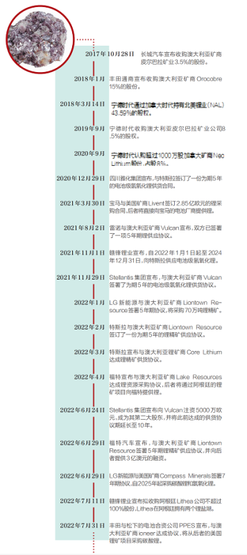 值得注意的是,此前,主機(jī)廠一般都是直接從電池廠商手中采購電池,并不太關(guān)注更上游的原材料問題?;葑u(yù)咨詢機(jī)構(gòu)表示,在2021年之前,只有兩筆車企針對上游的直接投資。其中之一是2017年10月,長城汽車宣布收購澳大利亞鋰礦商皮爾巴拉礦業(yè)3.5%的股份;另一筆是2018年,與豐田汽車同屬豐田集團(tuán)的豐田通商,收購了澳大利亞鋰礦開采公司Orocobre15%的股份,成為其股東。