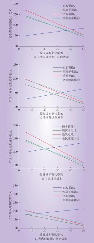 由圖8可知,不計(jì)及建設(shè)期、征地成本時,投資成本變化率低于35%時,抽水蓄能的LCC、LCOE最低;投資成本變化率高于40%時,鋰離子電池的LCC、LCOE最低。計(jì)及建設(shè)期時,投資成本變化率低于25%時,抽水蓄能的LCC、LCOE最低;投資成本變化率高于30%時,鋰離子電池的LCC、LCOE最低。計(jì)及征地成本時,投資成本變化率低于20%時,抽水蓄能的LCC、LCOE最低;投資成本變化率高于20%時,鋰離子電池的LCC、LCOE最低。計(jì)及建設(shè)期、征地成本時,投資成本變化率達(dá)到10%時,鋰離子電池的LCC、LCOE最低。
