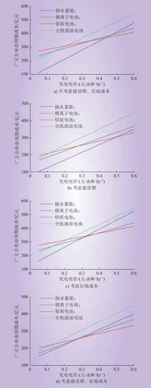 由圖7可知,在充電電價較低時,抽水蓄能的成本優(yōu)勢明顯;反之,鉛炭電池的成本優(yōu)勢明顯,以圖7 b)為例,充電電價小于0.5元/(kW·h)時,抽水蓄能成本最低;反之,鉛炭電池成本最低。建設(shè)期、征地成本等因素對不同儲能的成本競爭力具有一定的影響,對比圖7 b)和圖7 d),抽水蓄能與鉛炭電池成本競爭力的邊界降為0.3元/(kW·h)。鋰離子電池的全壽命周期成本總體處于抽水蓄能與鉛炭電池之間,而全釩液流電池的全壽命周期成本最高,僅在充電電價較低時具有部分競爭優(yōu)勢。