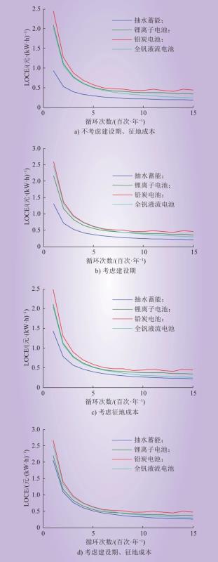 抽水蓄能的LCOE最低,鉛炭電池的LCOE最高;計(jì)及建設(shè)期時,充放電循環(huán)次數(shù)低于800次/年時,鋰離子電池的LCOE低于全釩液流電池。