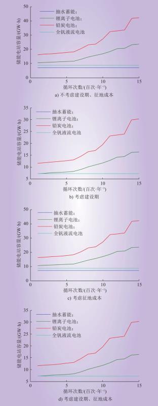 綜上可以看出,抽水蓄能具備成本優(yōu)勢,鋰離子電池儲能電站在項(xiàng)目建設(shè)期上優(yōu)勢顯著,鉛炭電池的壽命成為制約其市場化應(yīng)用的重要原因。結(jié)合4種儲能的技術(shù)特性,有必要分析充放電循環(huán)次數(shù)、儲能電站充電電價、投資成本的變化對結(jié)果的影響。
