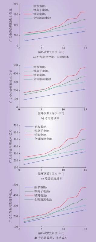 綜上可以看出,目前儲能技術(shù)經(jīng)濟(jì)水平下,與其他3種電化學(xué)儲能相比,抽水蓄能在LCC、LCOE等指標(biāo)方面均具有優(yōu)勢。比較分析3種電化學(xué)儲能技術(shù),鋰離子電池儲能項(xiàng)目建設(shè)周期短,計(jì)及項(xiàng)目建設(shè)期時,充放電循環(huán)次數(shù)低于800次/年時,鋰離子電池儲能具備成本優(yōu)勢;充放電循環(huán)次數(shù)高于800次/年時,全釩液流電池儲能具備成本優(yōu)勢;鉛炭電池儲能的成本最高。