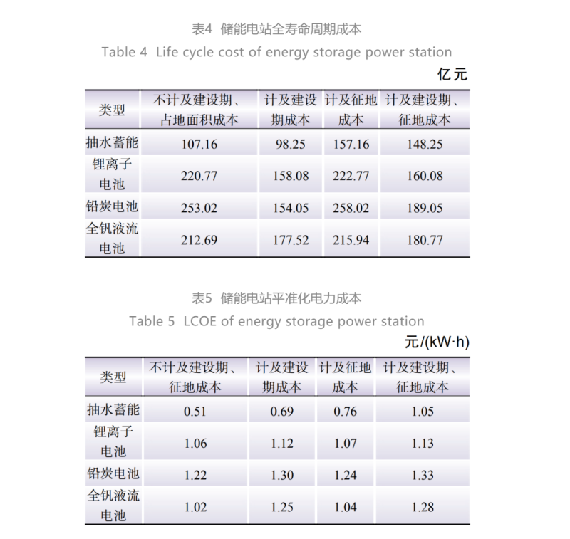 基于等效能折算,不計(jì)及建設(shè)期時,各類型儲能電站的規(guī)模分別為鋰離子電池儲能1789 MW/10733 MW·h、鉛炭電池儲能2763 MW/16581 MW·h、全釩液流電池儲能1440 MW/8641 MW·h;計(jì)及建設(shè)期時,各類型儲能電站的規(guī)模分別為鋰離子電池儲能1243 MW/7457 MW·h、鉛炭電池儲能1979 MW/11871 MW·h、全釩液流電池儲能1197 MW/7185 MW·h。儲能電站全壽命周期成本、平準(zhǔn)化電力成本計(jì)算結(jié)果如表4、表5所示。