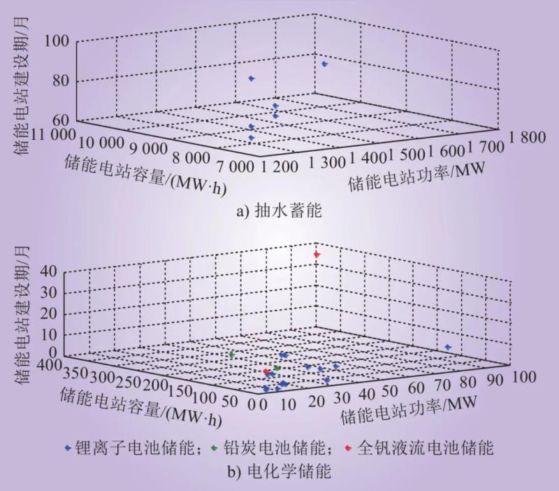 近年來落地/規(guī)劃的抽水蓄能電站主要分布在安徽、廣東、山東、浙江、河南、內(nèi)蒙古、湖北等地,鋰離子電池儲能電站主要分布在河南、江蘇、青海、福建、新疆、甘肅、內(nèi)蒙古、湖南、北京等地,全釩液流電池儲能電站位于遼寧,鉛炭電池儲能電站位于江蘇,不同類型儲能電站建設(shè)周期的散點(diǎn)分布如圖1所示。