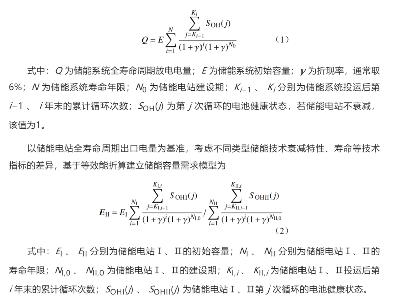 為客觀評價分析不同類型儲能的成本競爭力,需統(tǒng)一儲能電站全壽命周期放電電量,結(jié)合儲能系統(tǒng)壽命,以典型儲能容量為基準(zhǔn),通過等效能折算,結(jié)合容量衰減特性分析其他類型儲能容量。儲能容量定義為投運(yùn)時儲能電站可放電電量,電站級儲能應(yīng)用壽命評估的邊界條件通常設(shè)置健康狀態(tài)值低于80%[14]。儲能電站全壽命周期放電電量為