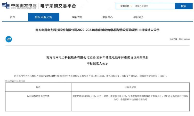 中國儲(chǔ)能網(wǎng)訊:8月8日,南方電網(wǎng)電力科技股份有限公司發(fā)布2022-2024年儲(chǔ)能電池單體框架協(xié)議采購項(xiàng)目中標(biāo)候選人公示,廈門海辰新能源科技有限公司(簡(jiǎn)稱“海辰儲(chǔ)能”)等五家企業(yè)成功入圍中標(biāo)候選人名單。