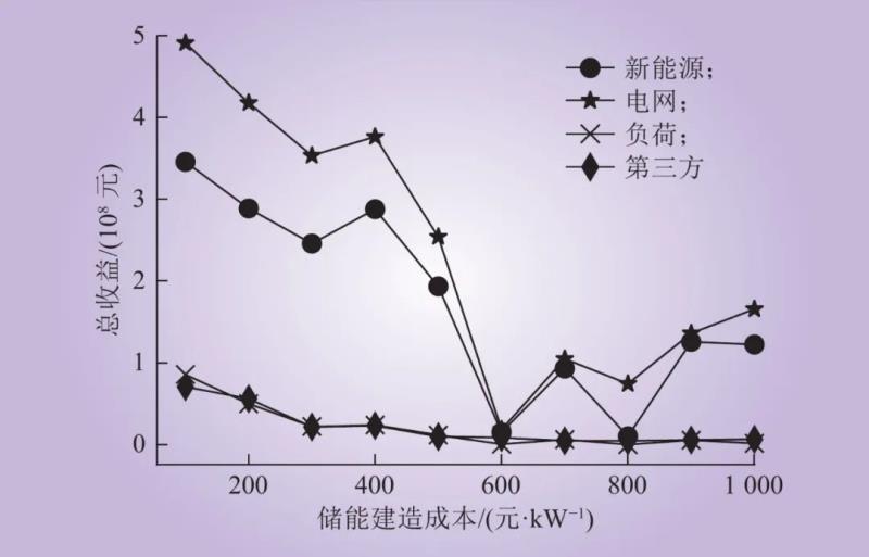 同樣,通過改變儲(chǔ)能建造成本,對(duì)各方收益影響進(jìn)行靈敏度分析。如圖9所示,儲(chǔ)能建造成本的改變會(huì)影響到整個(gè)市場(chǎng)的競(jìng)爭(zhēng)和投資策略,但影響并不是單調(diào)函數(shù);新能源與電網(wǎng)由于自身優(yōu)勢(shì),市場(chǎng)競(jìng)爭(zhēng)力較大。