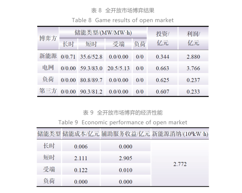 在市場(chǎng)全開放的商業(yè)模式中,新能源、電網(wǎng)和電力用戶同時(shí)作為儲(chǔ)能服務(wù)的供應(yīng)者和需求者,同時(shí)還有第三方投資者加入,同時(shí)參與市場(chǎng)博弈,其博弈結(jié)果如表8所示,其經(jīng)濟(jì)性能如表9所示。