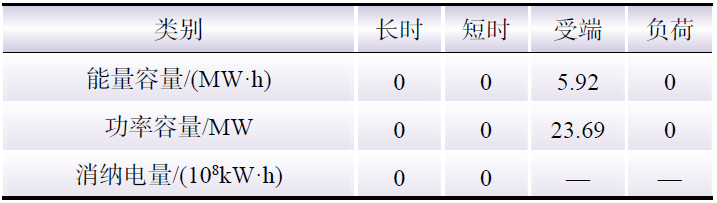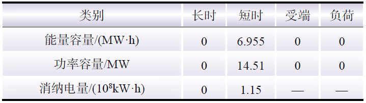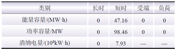 在新能源場(chǎng)站投資主導(dǎo)的商業(yè)模式中,新能源場(chǎng)站作為儲(chǔ)能服務(wù)的供應(yīng)者與需求者,而電網(wǎng)與負(fù)荷只作為需求方。通過三方博弈其結(jié)果如表4所示。在目前給出的電價(jià)環(huán)境下,新能源場(chǎng)站傾向于建設(shè)短時(shí)儲(chǔ)能,而其他儲(chǔ)能類型受成本限制,需求無(wú)法滿足。