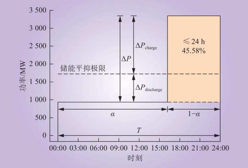 如圖1所示,由該日等效出力曲線可知,存在 1?α 的時(shí)段產(chǎn)生了高出力,若沒有任何日內(nèi)靈活性調(diào)節(jié)手段(系統(tǒng)備用、負(fù)荷響應(yīng)、儲(chǔ)能等),整體出力只能維持在最低水平,約45.58%的能量必須拋棄。如果要消納全部電量,必須配置功率調(diào)節(jié)容量約為 ΔP 的靈活調(diào)節(jié)電源來(lái)平衡風(fēng)電低出力帶來(lái)的功率缺額,而α太小會(huì)影響機(jī)組的利用效率,α 過大又會(huì)增大機(jī)組能耗。若使用儲(chǔ)能消納全部電量,最大須配置充放電功率分別為ΔPcharge 和 ΔPdischarge 的儲(chǔ)能裝置。