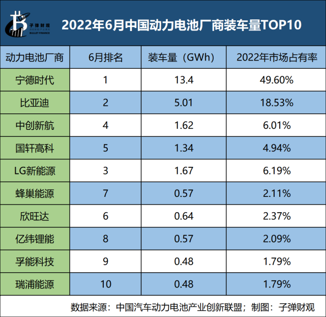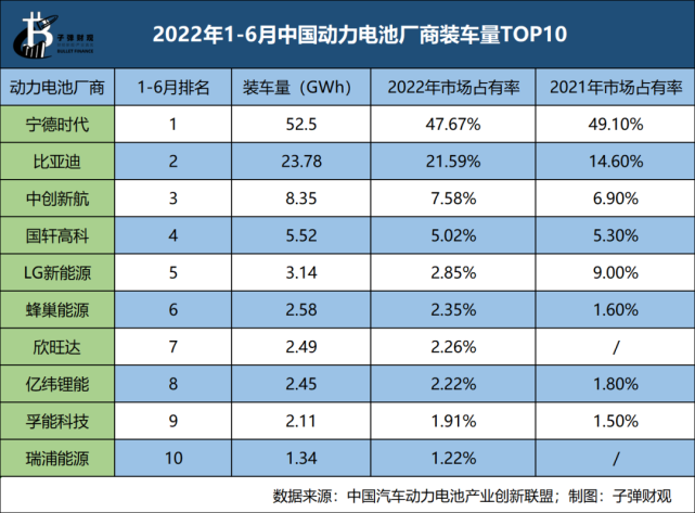 7月11日,中國汽車動(dòng)力電池產(chǎn)業(yè)創(chuàng)新聯(lián)盟公布了6月動(dòng)力電池裝車量數(shù)據(jù):中國動(dòng)力電池裝車量為27.0GWh,同比增長143.3%,其中寧德時(shí)代以13.40GWh的裝車量位列第一名,其市場占有率為49.60%,而比亞迪、LG新能源、中創(chuàng)新航和國軒高科位列第二至五名。