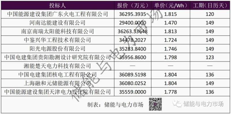 共10家企業(yè)參與投標(biāo),投標(biāo)單價區(qū)間為1.47~1.815元/Wh,均價1.75元/Wh。其中最高報價與最低報價分別出自中國能源建設(shè)集團(tuán)廣東火電工程有限公司與河南達(dá)能建設(shè)有限公司。另外,湘能楚天電力科技有限公司未參與報價。