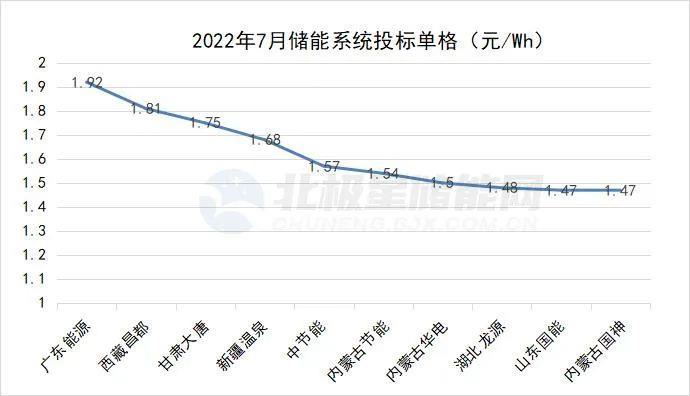 2022年7月儲能EPC總承包規(guī)模超830MW/1830MWh,投標(biāo)報(bào)價(jià)在1.42元/Wh到3.07元/Wh之間,除去山西應(yīng)縣獨(dú)立儲能項(xiàng)目、寧夏利通區(qū)同利變新型電化學(xué)儲能電站EPC、大唐儲能輔助調(diào)頻設(shè)備EPC開標(biāo)價(jià)格超過2元/Wh,其余儲能項(xiàng)目EPC投標(biāo)均價(jià)為1.66元/Wh,較上個(gè)月的1.75元/Wh有下降趨勢。其中中國電建成功摘得貴冠,先后拿下了5個(gè)項(xiàng)目,投標(biāo)總價(jià)超6.8億。