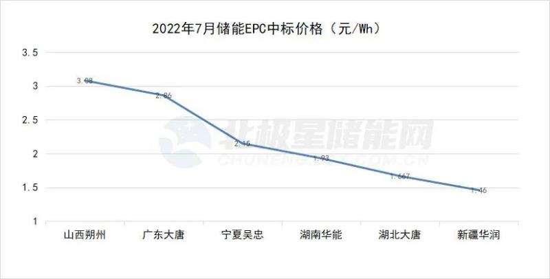 其中山西應(yīng)縣獨(dú)立儲能項(xiàng)目EPC招標(biāo)中,湖北省電力勘測設(shè)計(jì)院有限公司、中國電建集團(tuán)江西省水電工程局有限公司聯(lián)合體投標(biāo)報(bào)價(jià)3.07元/Wh,是七月份已知最高報(bào)價(jià)。
