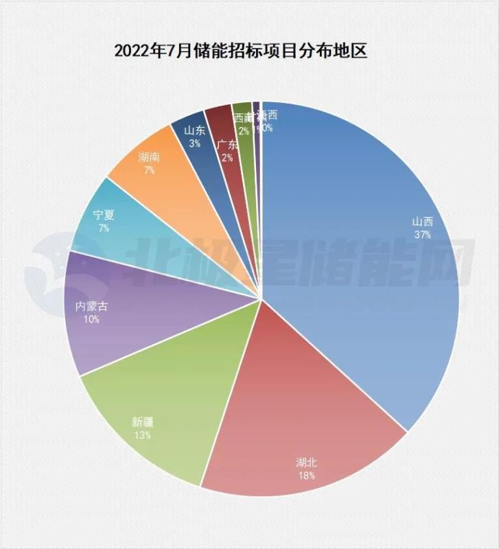 2022年7月,共有38個(gè)儲能項(xiàng)目開標(biāo)、總規(guī)模約3.09GWh。從地域來看,43個(gè)項(xiàng)目分布于山西、寧夏、湖北、內(nèi)蒙古、甘肅、河南等12省區(qū)。其中山西儲能項(xiàng)目采購規(guī)模最大,共計(jì)4個(gè)儲能項(xiàng)目總規(guī)模超700MW/1100MWh。