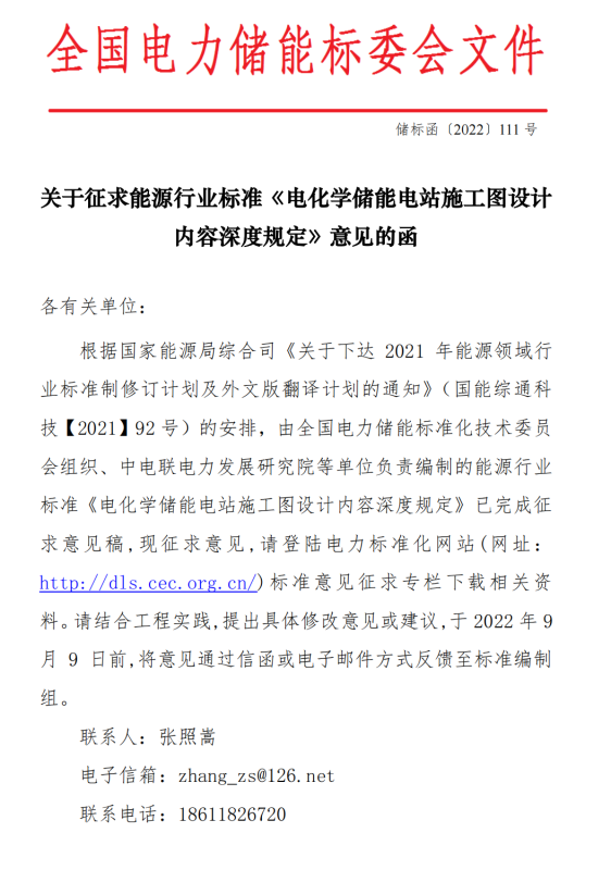 關(guān)于征求能源行業(yè)標(biāo)準(zhǔn)《電化學(xué)儲(chǔ)能電站施工圖設(shè)計(jì)內(nèi)容深度規(guī)定》意見(jiàn)的函