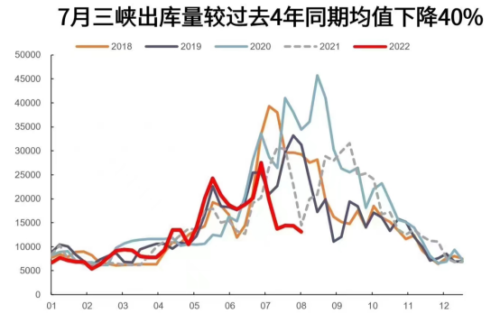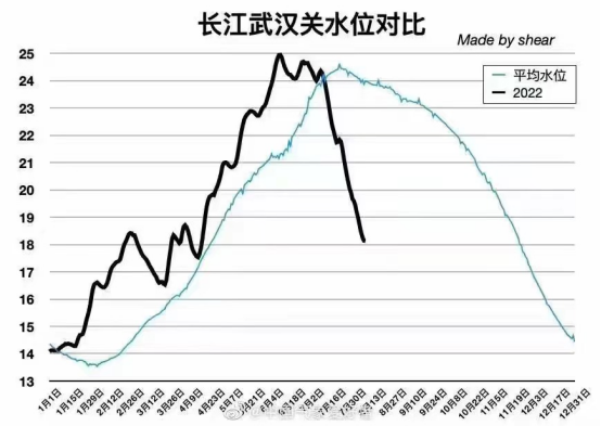 從水利角度來(lái)看,今年旱情嚴(yán)重,嚴(yán)重影響了長(zhǎng)江流域的水量。6月中旬以來(lái),長(zhǎng)江流域降水由偏多轉(zhuǎn)為偏少,其中,6月下旬偏少2成,7月偏少3成多,尤其是長(zhǎng)江下游干流及鄱陽(yáng)湖水系偏少5成左右,為近10年同期最少。