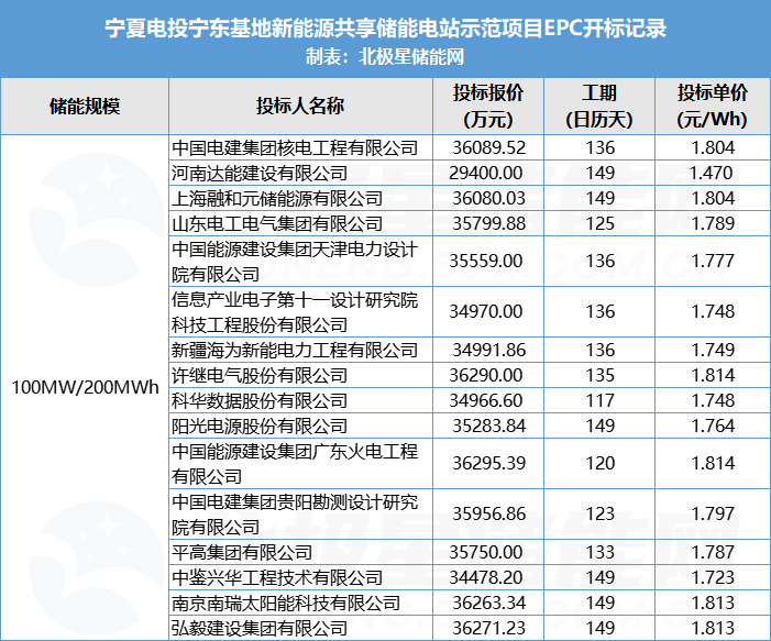 中國儲能網(wǎng)訊:8月16日,寧夏電投寧東新能源有限公司發(fā)布寧夏電投寧東基地新能源共享儲能電站示范項目一期100MW/200MWh工程EPC總承包中標(biāo)候選人公示。開標(biāo)記錄顯示,本次共有16家企業(yè)參與其中,最低投標(biāo)單價為1.47元/Wh。