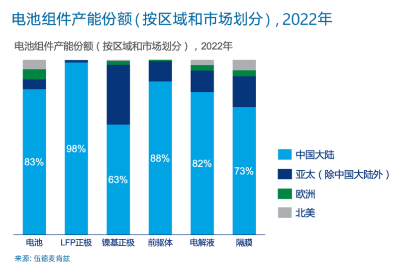 中國在電池組件的生產(chǎn)中占主導地位,在每個環(huán)節(jié)都至少占60%的全球市場份額。目前,鎳鈷錳三元鋰電池供應(yīng)仍占電動車市場的46%和儲能系統(tǒng)市場的55%。2022年,磷酸鐵鋰(LFP)電池的市場份額有望從2021年的25%增加到27%。在未來十年中,所有的電池組件產(chǎn)能都將有強勁的增長,尤其是到2030年,電解液的增長將達到4.5倍。