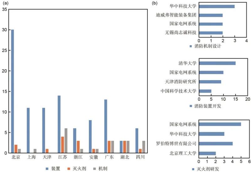 圖5 (a) 儲(chǔ)能系統(tǒng)消防技術(shù)地域分布;(b) 相關(guān)領(lǐng)域?qū)@饕暾?qǐng)人