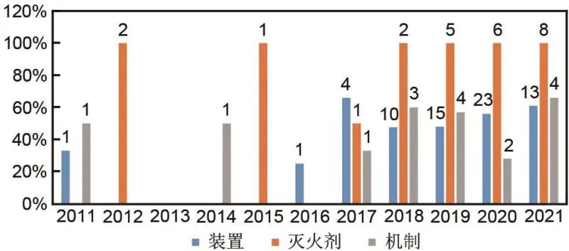 圖4 儲(chǔ)能系統(tǒng)消防各領(lǐng)域發(fā)明專(zhuān)利年申請(qǐng)量及占比