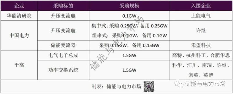 在逆變器方面,開展集采的企業(yè)與電池簇較為一致,均是為了滿足內部系統集成的需求,涉及的采購規(guī)模達4.2GW,目前共有上能電氣、許繼集團等11家入圍。