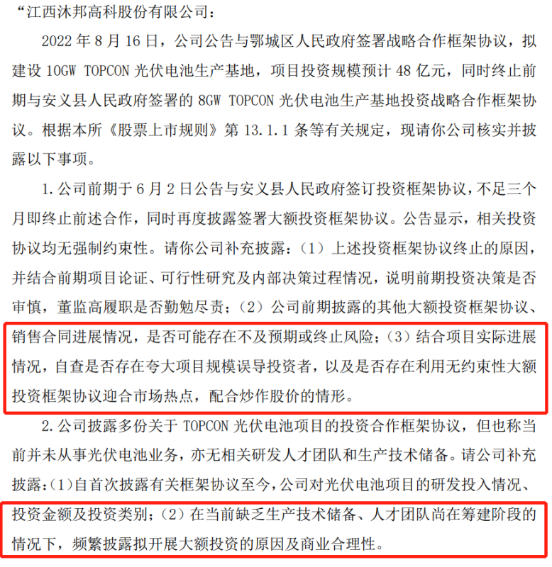 這引得上交所接連質(zhì)疑是否存在夸大項目規(guī)模誤導投資者,是否存在利用無約束性大額投資框架協(xié)議迎合市場熱點,配合炒作股價。