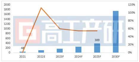 2021-2030年中國(guó)儲(chǔ)能鋰電池出貨量及預(yù)測(cè)(單位:GWh,%)