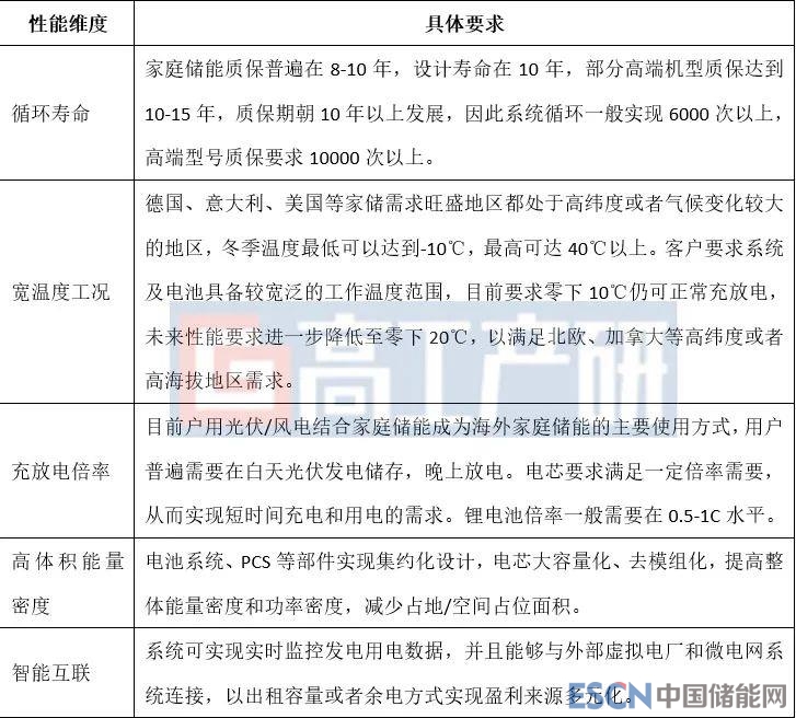 戶用家儲應(yīng)用于小型戶用備電場合,儲能系統(tǒng)帶電量普遍在5-20KWh。產(chǎn)品要求方面,戶用家儲產(chǎn)品在電氣安全和機(jī)械安全得到滿足的前提下,性能要求集中在長循環(huán)壽命、寬溫度工況、充放電倍率和高體積能量密度等方面。產(chǎn)品平臺高壓化是戶用家儲產(chǎn)品發(fā)展重要趨勢。高壓化可降低電流,進(jìn)而減少放熱量,提升放電效率和安全性。隨著電動(dòng)車全球范圍普及、居民電價(jià)成本持續(xù)提升,戶用家儲系統(tǒng)容量有逐步增加的趨勢,系統(tǒng)容量有望逐步從10KWh以下提升至15KWh以上,戶用PCS功率也將從3KW、5KW提升到8KW乃至三相10KW以上迭代。