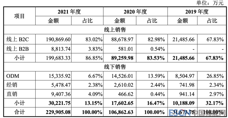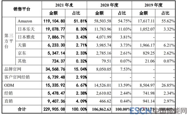 從公司的銷售渠道來看,公司目前的銷售以線上電商為主,公司主要通過亞馬遜、日本樂天、日本雅虎、天貓及京東等國 內(nèi)外知名第三方電商平臺銷售產(chǎn)品,報告期內(nèi)公司通過電商平臺開展的線上銷售的銷售額占主營業(yè)務收入比重分別為 67.83%、85.53%和 86.85%。