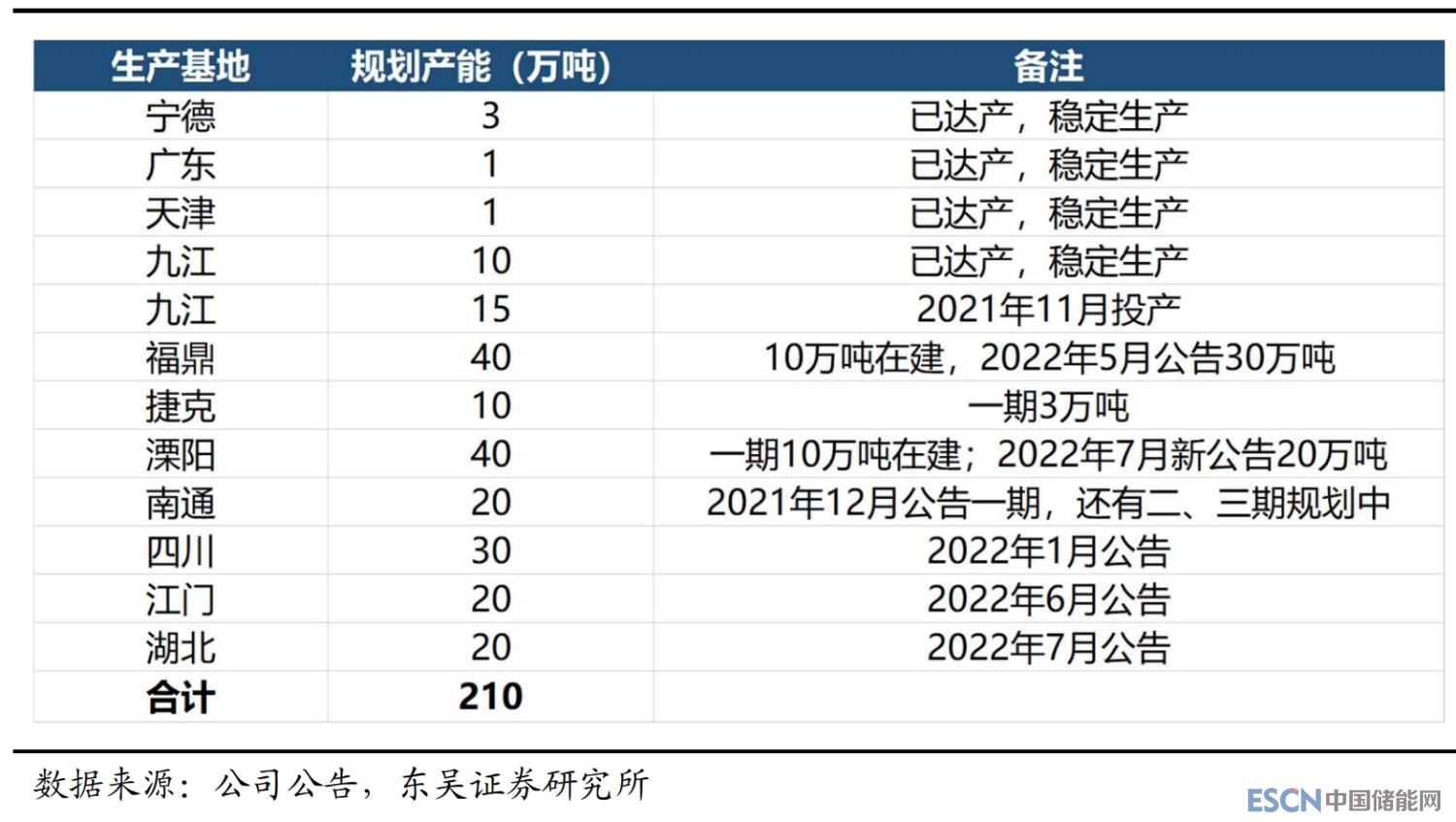 到今年下半年,天賜材料電解液出貨量有望進(jìn)一步增長。據(jù)東吳證券預(yù)計(jì),天賜材料2022年電解液出貨量將達(dá)到33萬噸,同比增長129%。產(chǎn)能增長是由于此前天賜材料積極擴(kuò)產(chǎn)。據(jù)不完全統(tǒng)計(jì),目前,公司在福鼎、南通、眉山、江門等地均有規(guī)劃電解液項(xiàng)目。今年6月下旬,天賜材料發(fā)布《電解液全球運(yùn)營白皮書》提到,公司全球規(guī)劃總產(chǎn)能已超過200萬噸。