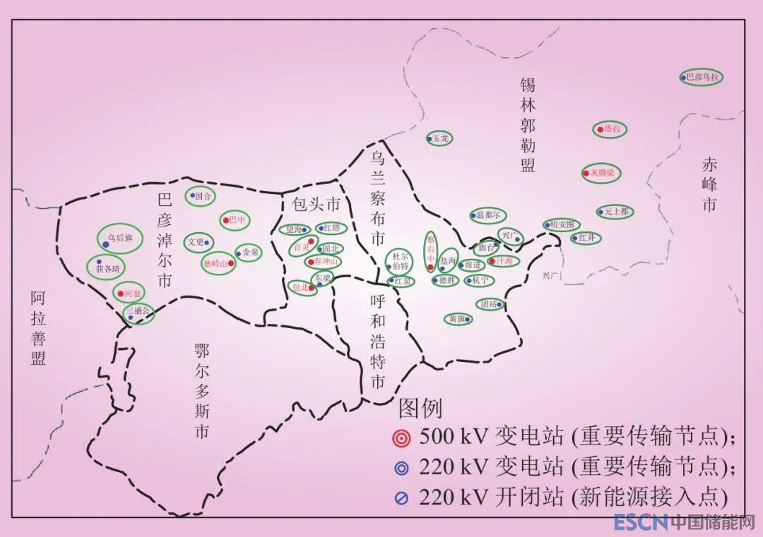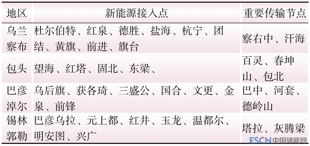 對儲能的配置位置進(jìn)行合理規(guī)劃是降低儲能系統(tǒng)投資、提高運(yùn)行效益以及提升整個系統(tǒng)運(yùn)行穩(wěn)定性和資源利用效率的重要手段。文獻(xiàn)[24]提出了針對新能源側(cè)儲能選址優(yōu)化的通用性結(jié)論:在電力系統(tǒng)中的重要傳輸節(jié)點和可再生能源的發(fā)電接入點配置儲能可以在兼顧經(jīng)濟(jì)性和系統(tǒng)穩(wěn)定性的因素下達(dá)到儲能選址配置的最優(yōu)。因此,本文采用上述結(jié)論進(jìn)行蒙西地區(qū)儲能選址分析。以《內(nèi)蒙古電網(wǎng)2021年度運(yùn)行方式》提供的相關(guān)資料為參考依據(jù),蒙西地區(qū)的風(fēng)電、光伏資源主要集中在烏蘭察布、包頭、巴彥淖爾以及錫林浩特地區(qū),分別占蒙西地區(qū)新能源裝機(jī)容量的23.32%、21.63%、17.86%和15.62%。這些地區(qū)的重要傳輸結(jié)點以察右中、百靈、巴中、塔拉等500 kV變電站為主。在兼顧系統(tǒng)穩(wěn)定性及經(jīng)濟(jì)性因素下,重點在上述4個地區(qū)的新能源接入點和重要傳輸節(jié)點進(jìn)行儲能配置,具體選址如表1所示。其中,新能源接入點主要為220 kV變電站,重要傳輸節(jié)點為500 kV變電站,部分重要傳輸節(jié)點亦是新能源接入點,不再重復(fù)列出。