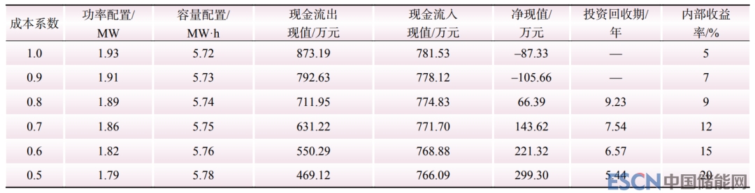 表8 不同成本系數(shù)下儲能投資經(jīng)濟(jì)性分析