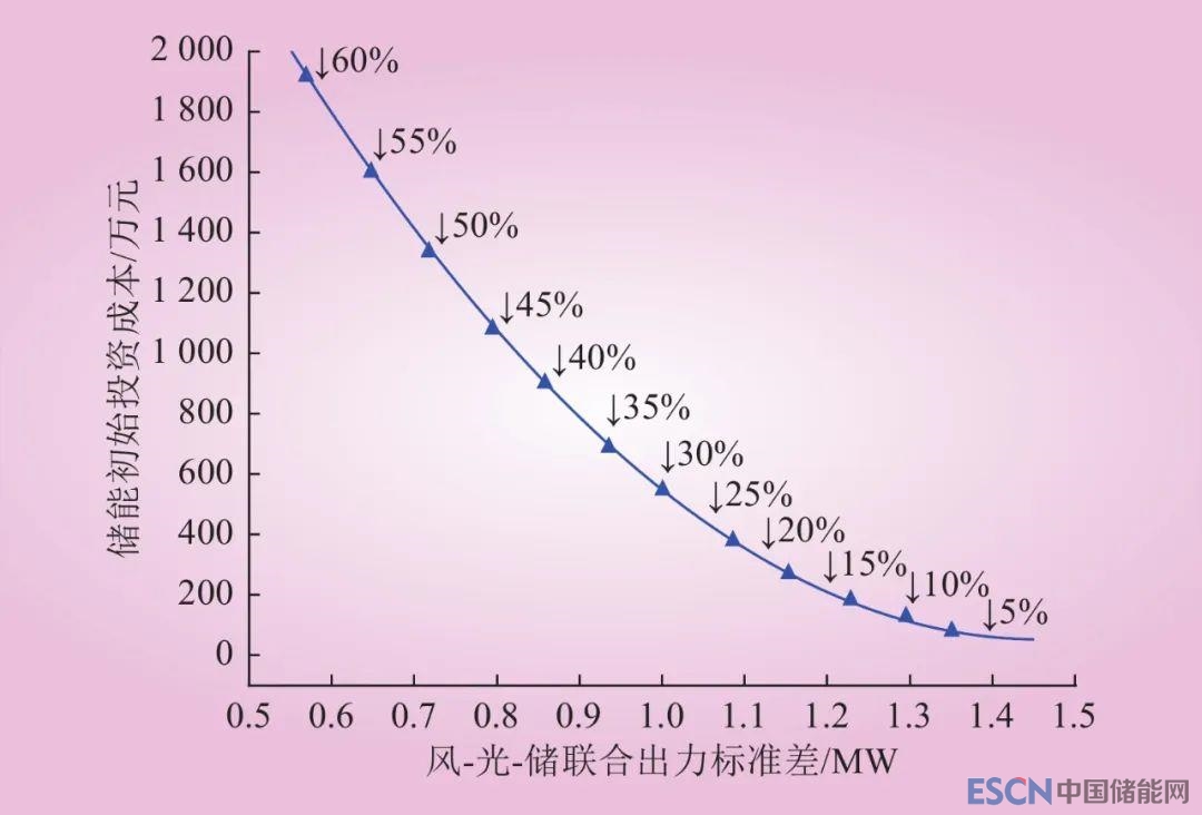 投資成本是儲能規(guī)劃設(shè)計的一項重要經(jīng)濟(jì)性指標(biāo),基于技術(shù)、經(jīng)濟(jì)性優(yōu)化結(jié)果可得到儲能系統(tǒng)投資成本與風(fēng)-光-儲聯(lián)合出力標(biāo)準(zhǔn)差之間的帕累托曲線,如圖5所示。隨著風(fēng)光出力波動抑制率的不斷提高,儲能的初始投資成本不斷提高,且提高速率逐漸增加。風(fēng)光出力波動抑制率從5%提升到35%,儲能的初始投資成本僅增加658.61萬,而從35%提升到60%,儲能的初始投資成本增加1 213.02萬元,為滿足更高的風(fēng)光出力的技術(shù)性要求需要投入的儲能成本將顯著提升。